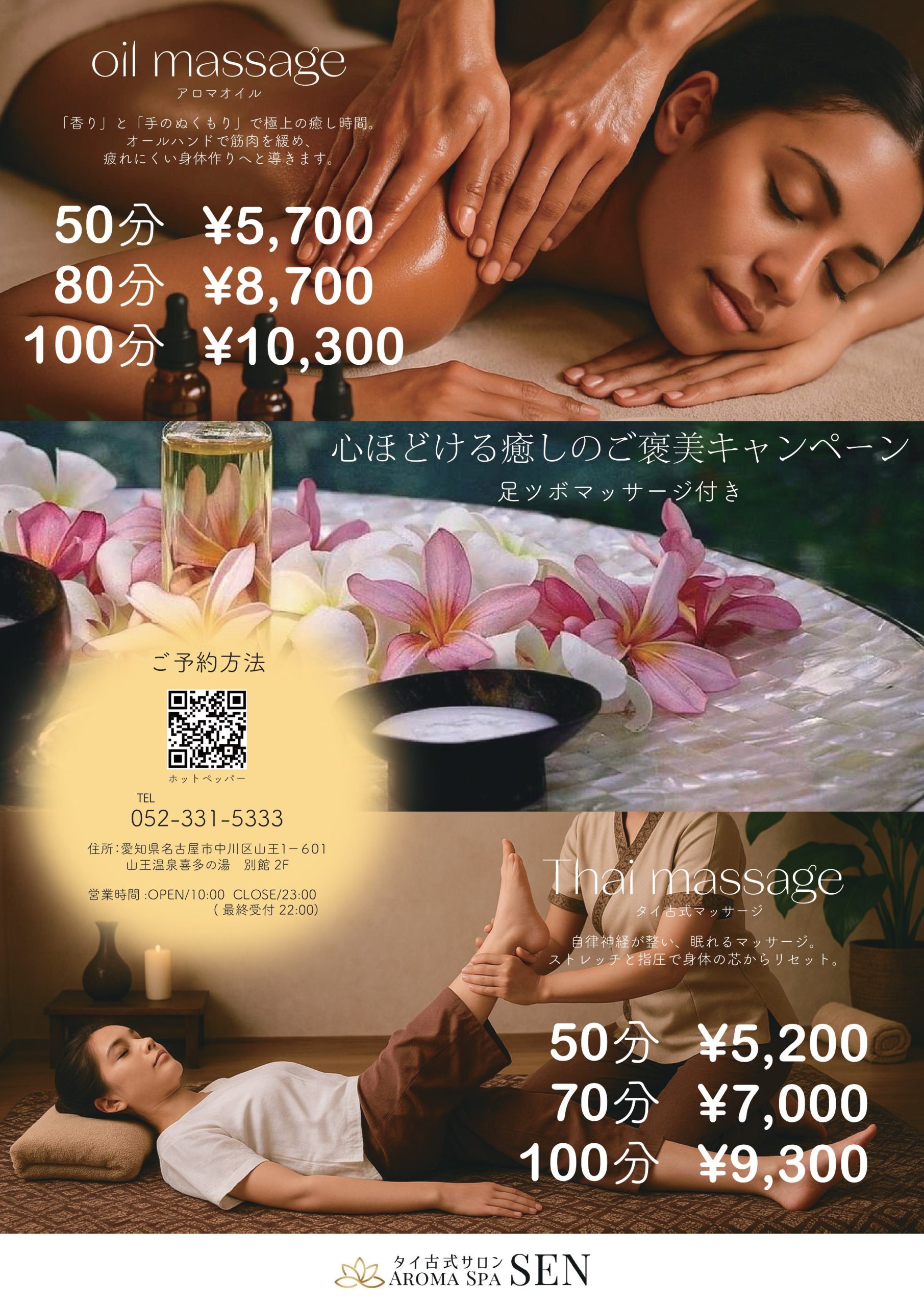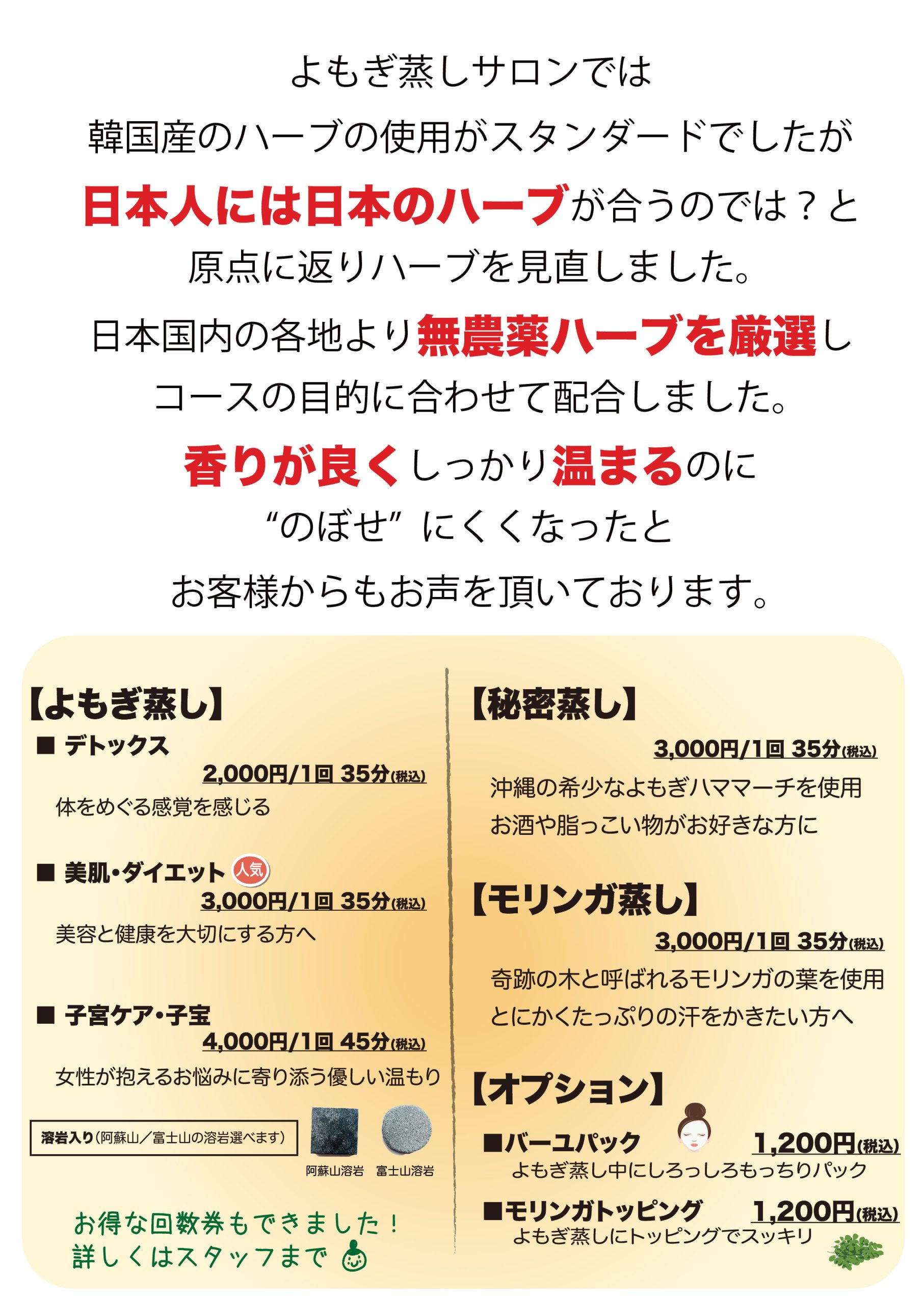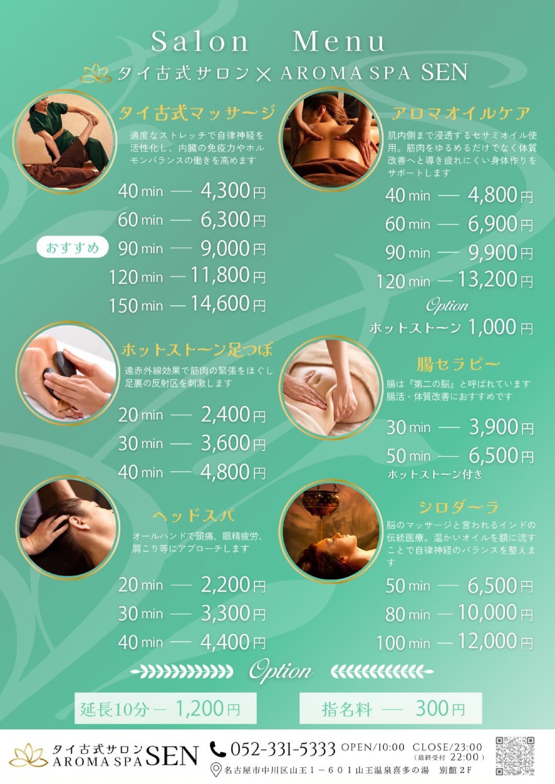 ※中学生以上のご利用となります。※専用着・大判敷きタオル貸し出しを含む。(入浴料が別途必要です。) ※料金はすべて消費税を含めます。 |