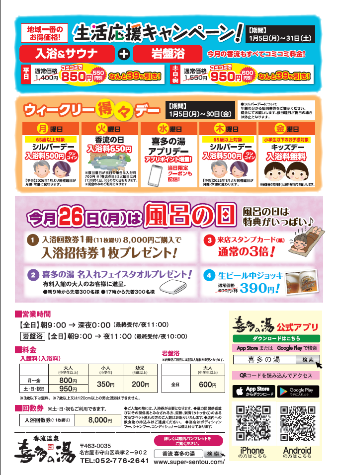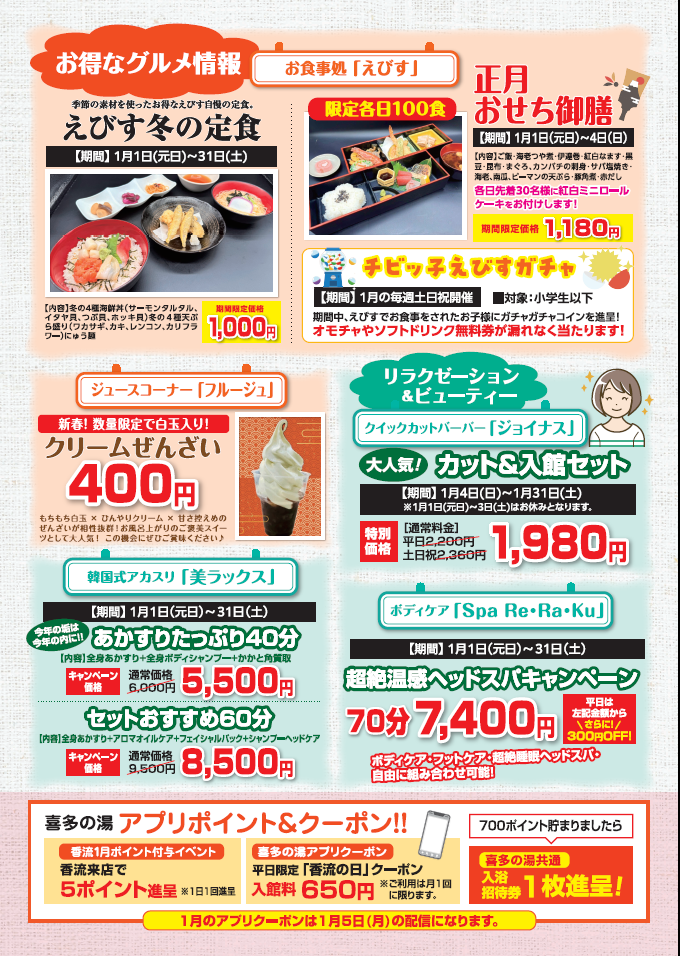 いつも香流温泉 喜多の湯にお越し下さいまして 誠にありがとうございます。 新年★1月の喜多の湯通信★のご案内をさせて頂きます。 元日~4日迄、お値段や営業時間が変わる日がございます。 ご来店前にはぜひ、営業時間のご確認をおねがいします。 皆様ぜひ、ご来館くださいませ。 スタッフ一同お待ちいたしております。
