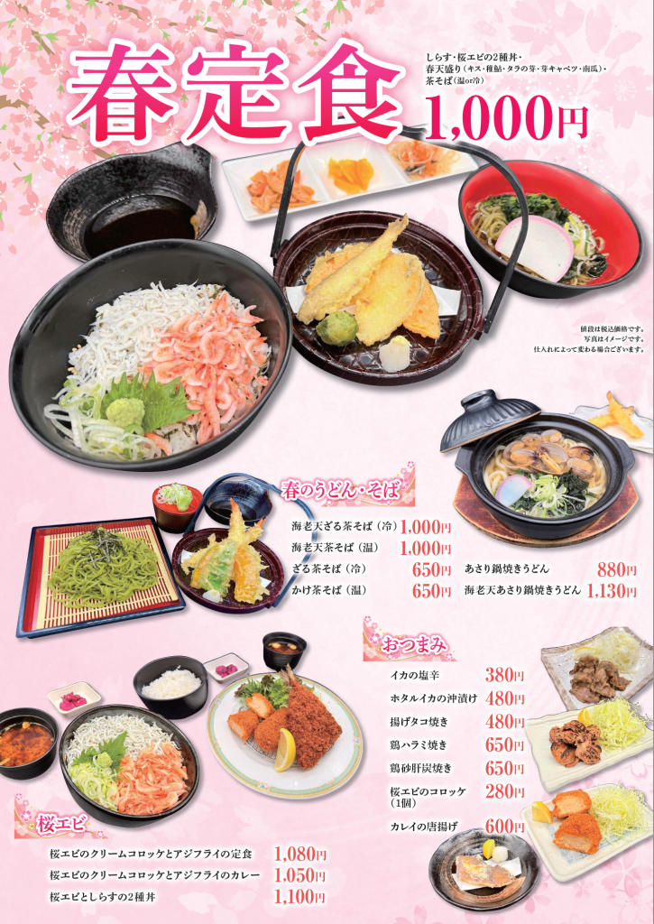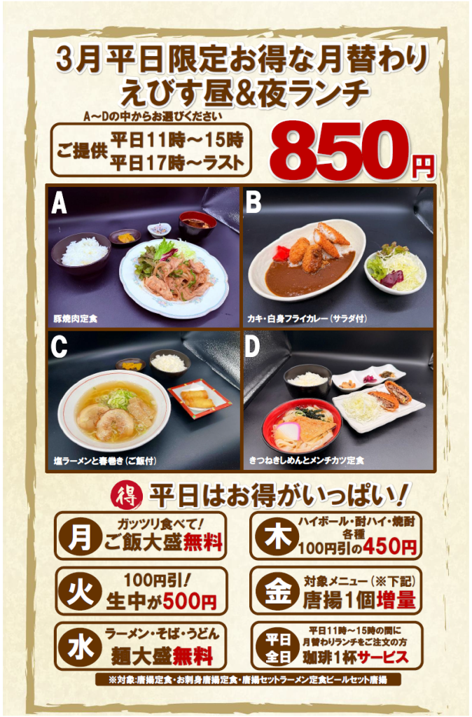 いつも「お食事処 えびす」をご愛顧いただき、誠にありがとうございます。 3月のオトクなグルメ情報のご案内をさせて頂きます。 3月1日より春メニューをご用意致しました。 皆様のご来館、スタッフ一同お待ちいたしております。