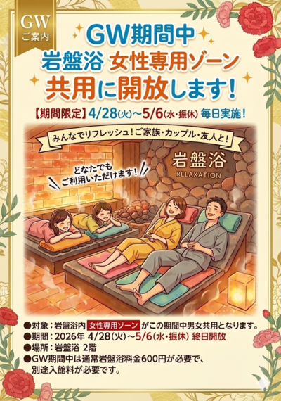 この度、GW期間中に当たる 4/28(火) ~ 5/6(水・振休) の間、岩盤浴での女性専用コーナーを共用スペースに開放します。