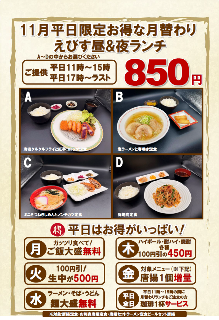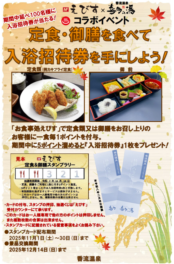 いつも「お食事処 えびす」をご愛顧いただき、誠にありがとうございます。 11月のオトクなグルメ情報のご案内をさせて頂きます。 11月は大好評でした「定食スタンプラリー」を開催いたします。 先着100名様ですのでお早めに! 皆様のご来館、スタッフ一同お待ちいたしております。